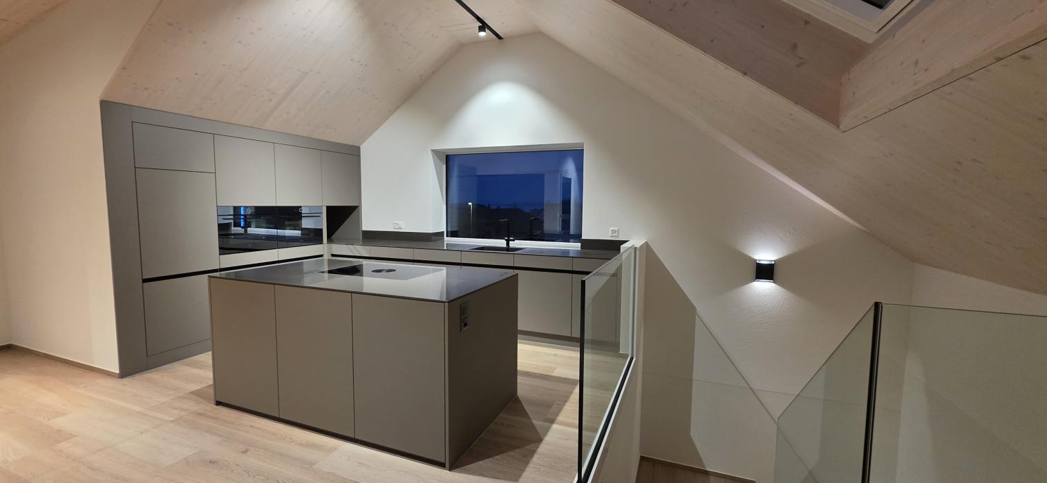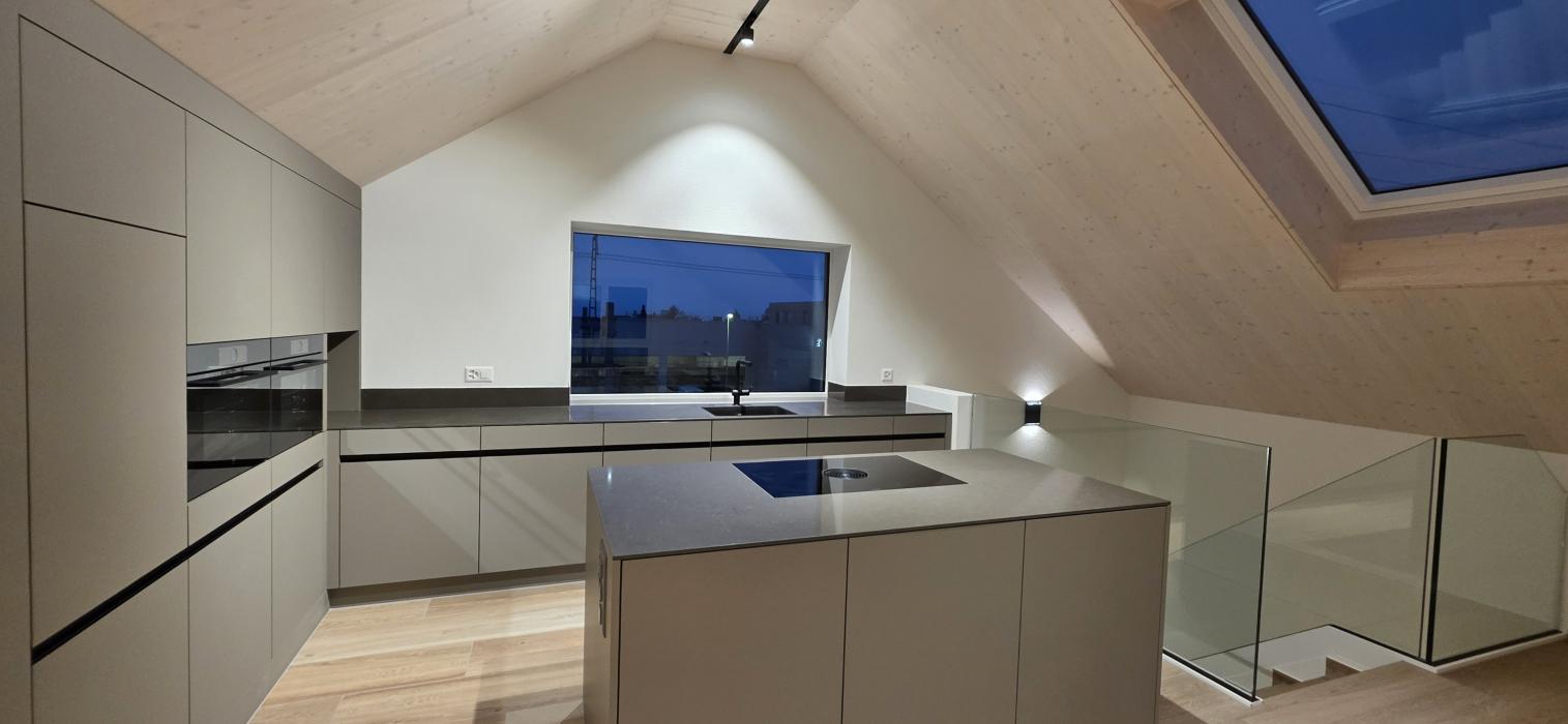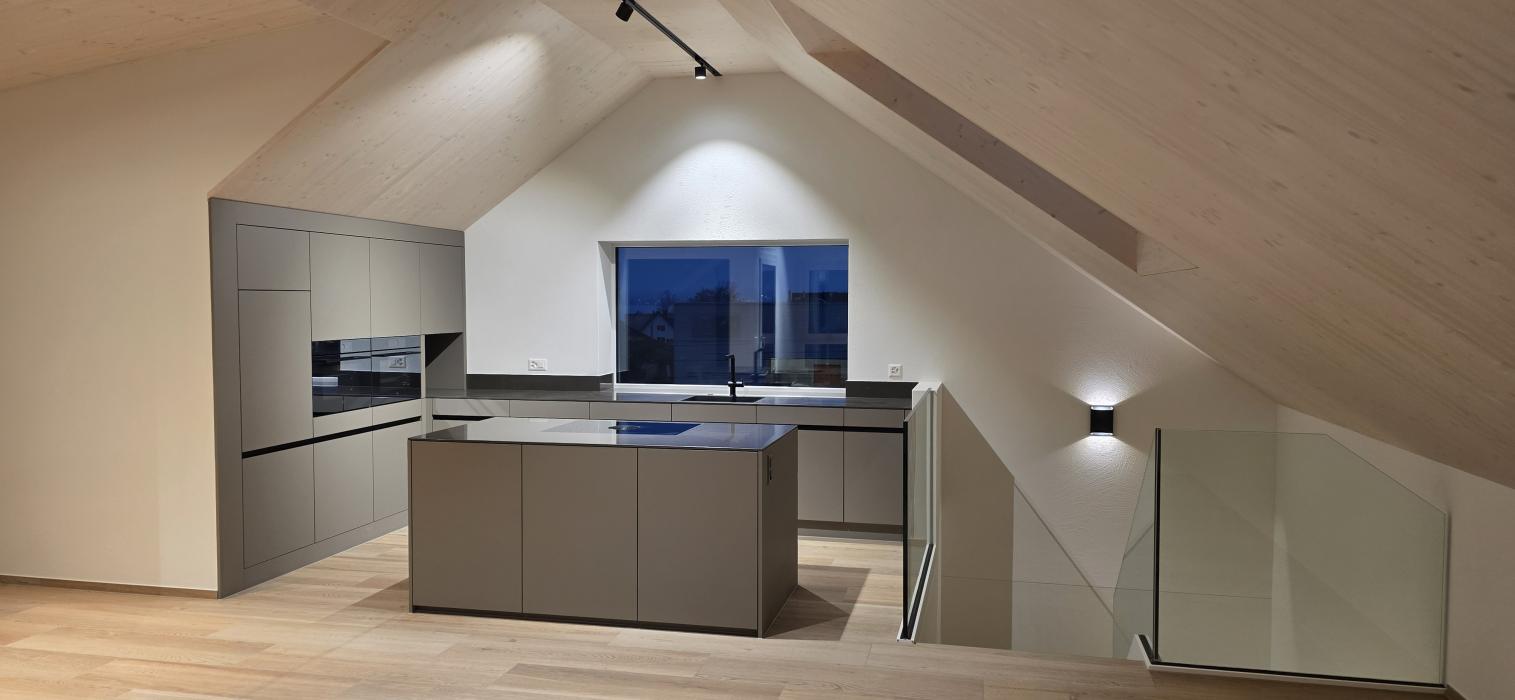Dachgeschossküche Bauobjekt: 2025 Föhn Schreinerei AG Industrie 15 8842 Unteriberg 055 414 13 65 info@foehn-schreinerei.ch www.foehn-schreinerei.ch Zum Unternehmensprofil Arbeitsbereiche Küchen