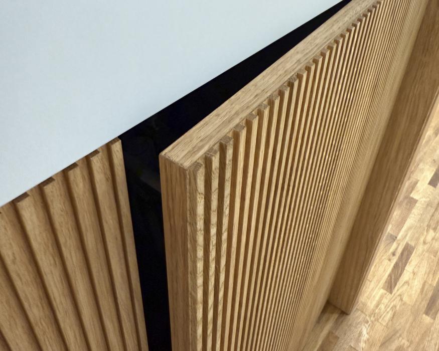TV Möbel hängend mit Akustiklamellen in Eiche rustikal Neubau Einfamilienhaus Erlinsbach