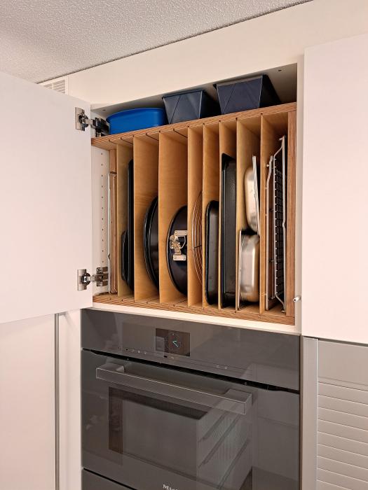 Schränke und Raumtrenner - Fronten farblackiert, Raumtrenner und Griffleisten Eiche massiv gebeizt, lackiert
