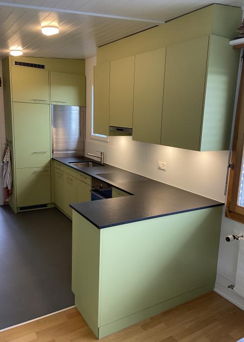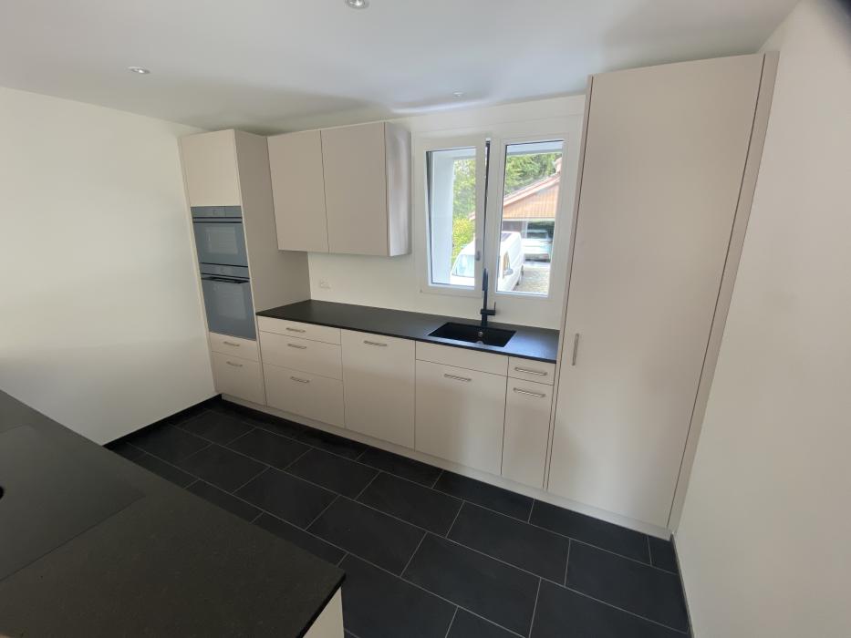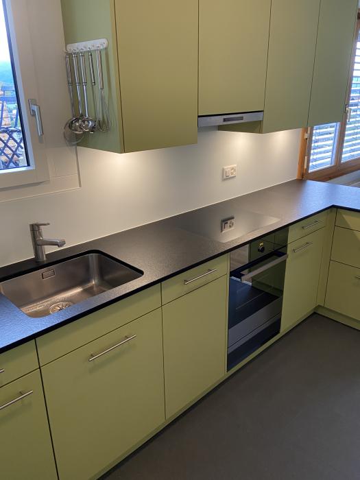 Küche dunkel mit dunkler Armatur Neubau Mehrfamilienhaus